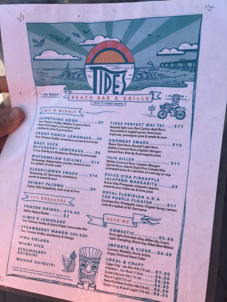 Tides Beach Bar & Grille, located in Jacksonville Beach, FL, offers a casual, touristy atmosphere perfect for groups looking to enjoy live music and happy hour specials. This beachfront tiki bar provides a variety of dishes, including the popular Crab Cake and Fish Tacos. The Chicken and Spinach Wrap and Grouper Sandwich are also standout options. The bartenders serve reasonably priced, strong drinks like the Tide Perfect Mai Tai and Elderflower Smash. With excellent food, friendly staff, and beach views, Tides Beach Bar & Grille is a great spot for a day by the ocean. Experience the flavors of the beach at this vibrant establishment.